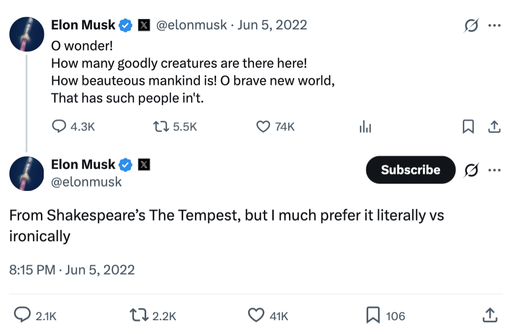 It should not come as a surprise that Elon Musk has stated that his favorite poetry is written by Shakespeare.